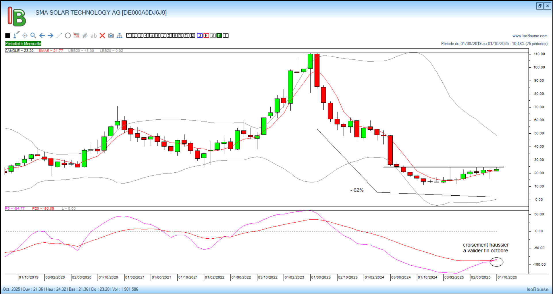 Actuellement, à 5 séances de la fin du mois, le retournement à la hausse se produit. Ce retournement devra être validé le 31 octobre pour faire entrer la valeur en portefeuille.
