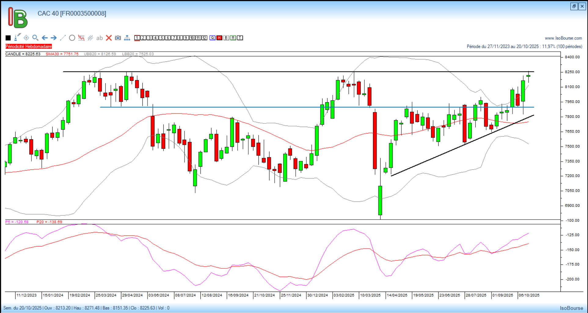 Comme mentionné précédemment, le CAC 40 se trouve au contact de la résistance historique des 8270 points.