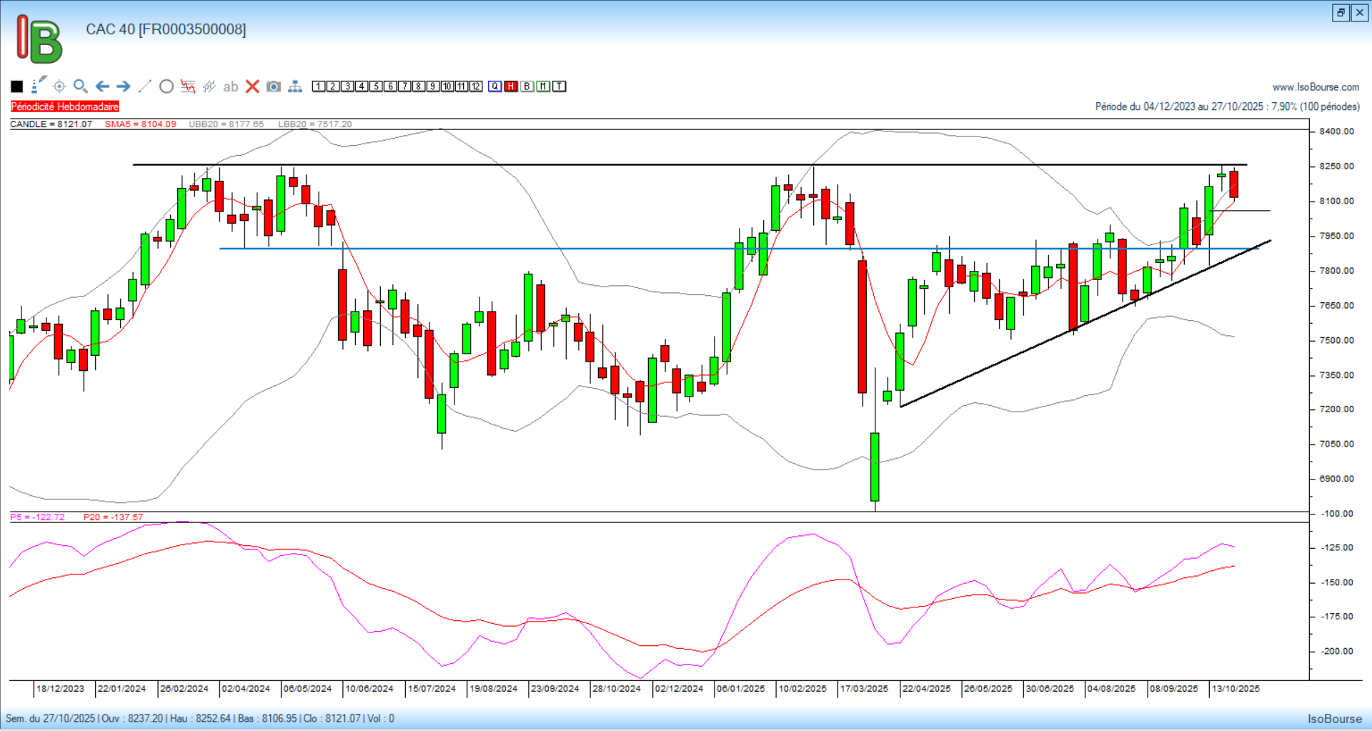 Cependant, la fin du mois a été moins favorable; après le sommet historique atteint le 21 octobre (8271 points), l’indice a reculé pour revenir sur les 8121 points en clôture.