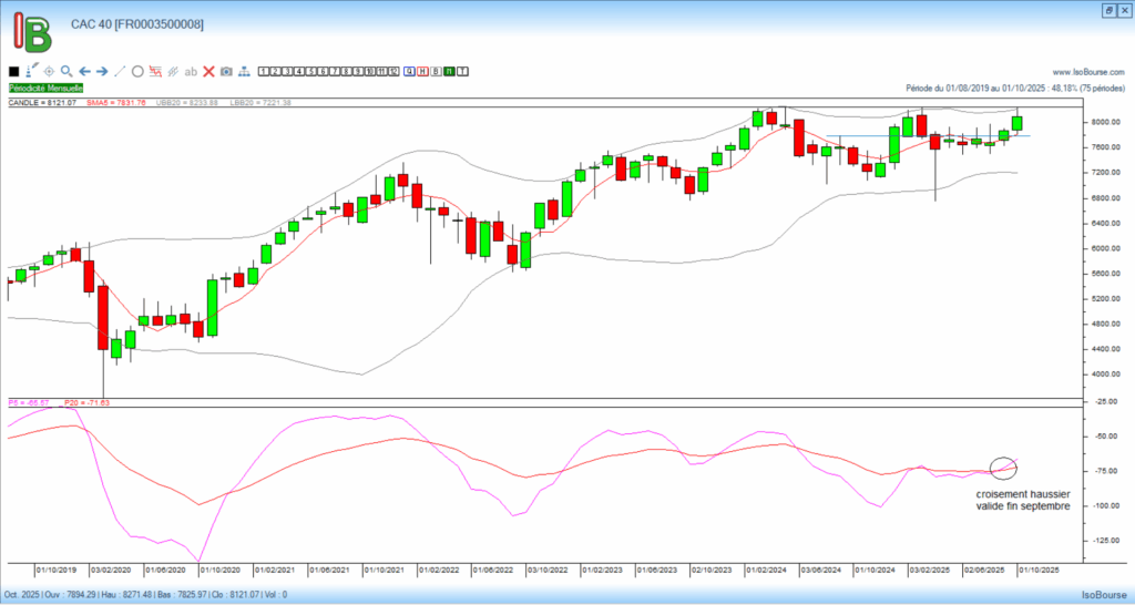 Si le repli devait se poursuivre, comme déjà précisé, celui-ci devrait se limiter à l’axe médian de la bougie précédant le doji (8065 points) aidé par l’orientation positive des courbes de pression 5 et 20 semaines, ainsi que celles des 5 et 20 mois.