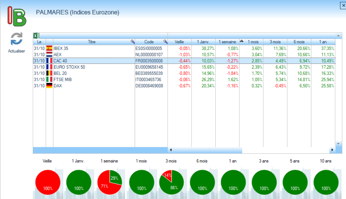 Néanmoins, sa performance mensuelle s’élève à 2,85 % derrière l’IBEX 35 et l’AEX (voir tableau ci-dessous) le laissant toutefois loin des principaux indices de l’Eurozone en performance annuelle.