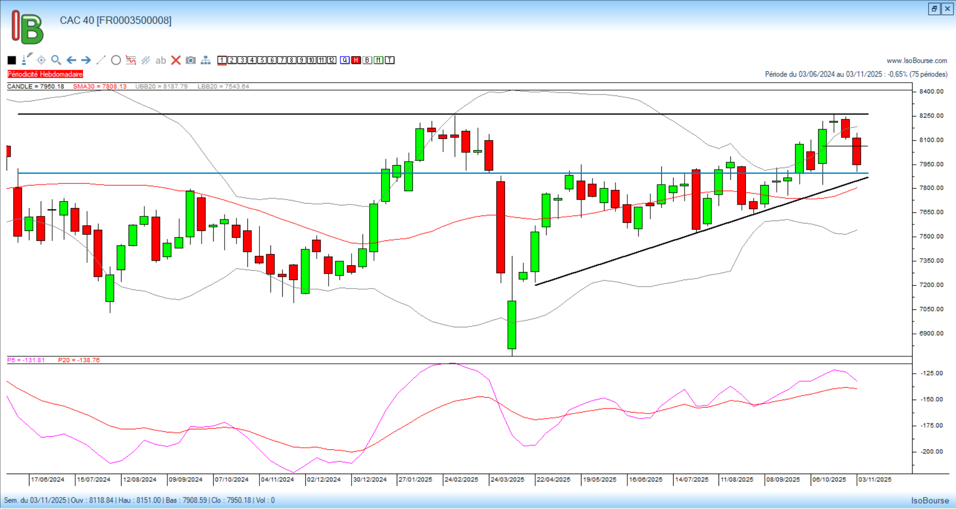 L’hésitation sous la résistance historique des 8271 points s’est logiquement prolongée cette semaine, mais de manière plus marquée par une baisse sous les 8065 points.