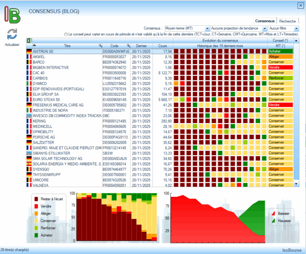 - Carbios a par contre réalisé un mois de novembre en hausse de 30,24 % le plaçant désormais en conseil de renforcement après être passé en tendance haussière de moyen terme fin août 2025.