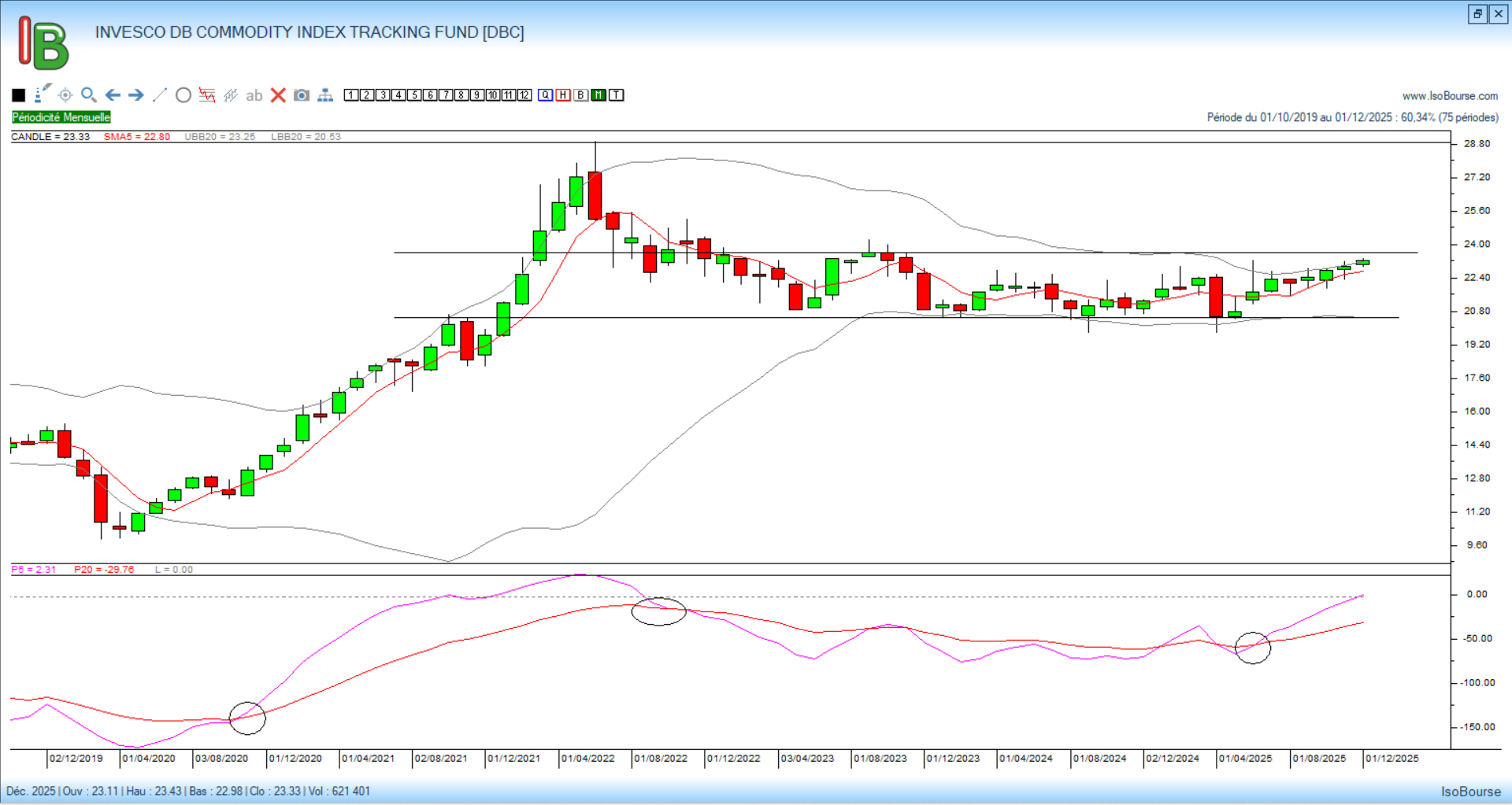 L’envolée des matières premières à partir de mai 2020 et ce jusque juin 2022, a ensuite donné le départ à une longue consolidation qui se trouve toujours d’actualité. Cependant, suite au croisement haussier des courbes de Pression Isobourse survenu fin juin 2025, une dynamique haussière s’est mise en place sans que nous soyons à ce stade sortis du range latéral dans lequel évolue l’indice.