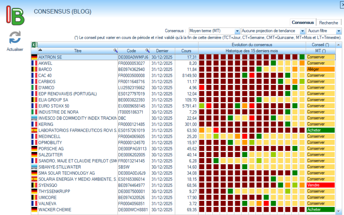 Pour ce qui concerne Akwel et Syensqo en situation d’allégement le mois denier, la première peut être conservée, alors que la seconde affiche un retournement de tendance par croisement baissier des courbes de Pression Isobourse 5 et 20 mois. Syensqo ne figurera plus dans les portefeuilles début janvier (depuis le conseil d’achat fin août 2025, la valeur abandonne 9 %)