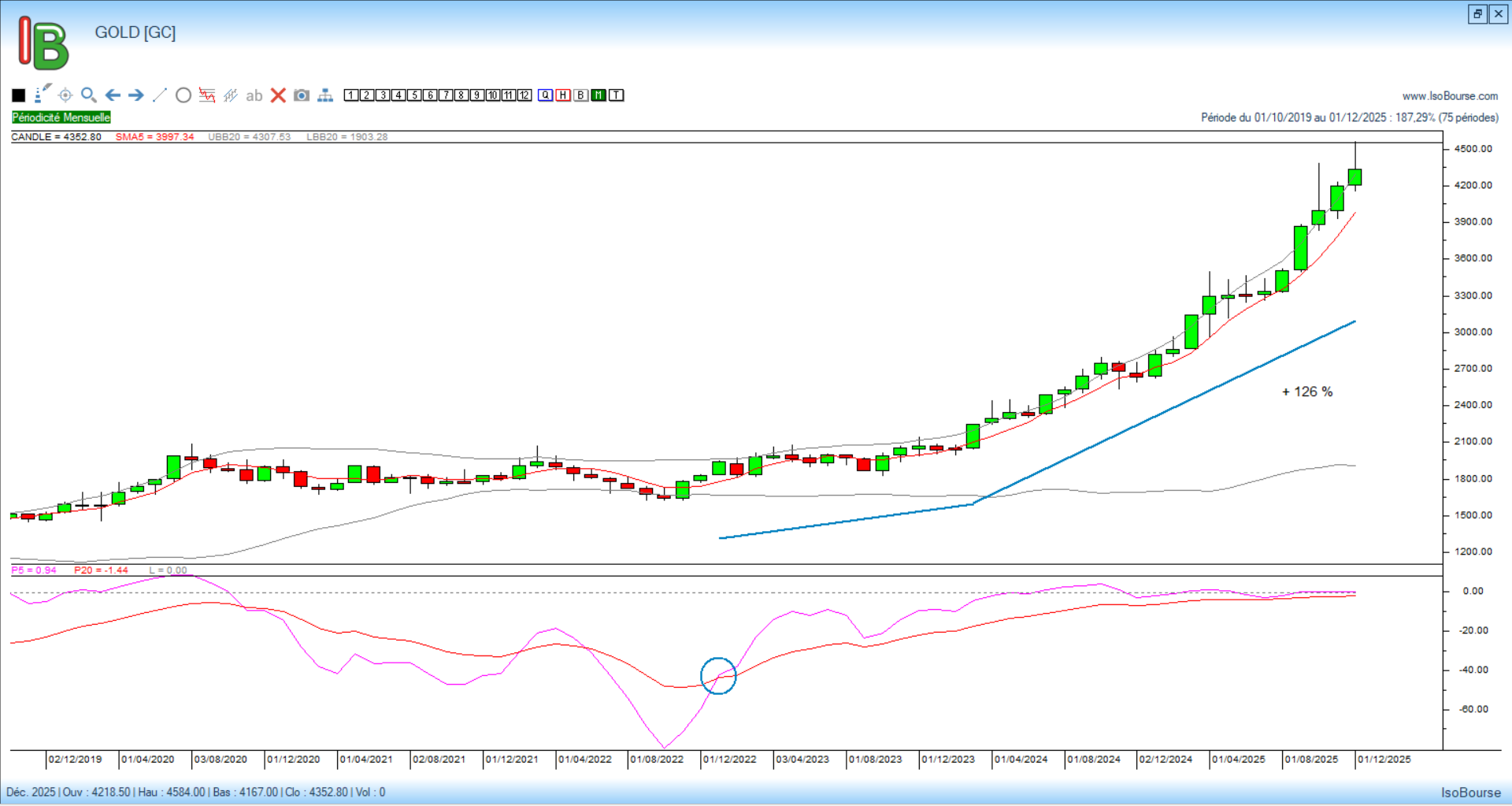 Depuis son passage en tendance haussière fin janvier 2023, la valeur refuge progresse désormais de 126 %. En 2025, sa progression atteint 65 % atteignant des sommets historiques grâce aux achats des banques centrales ainsi qu’en raison de la faiblesse actuelle du dollar.