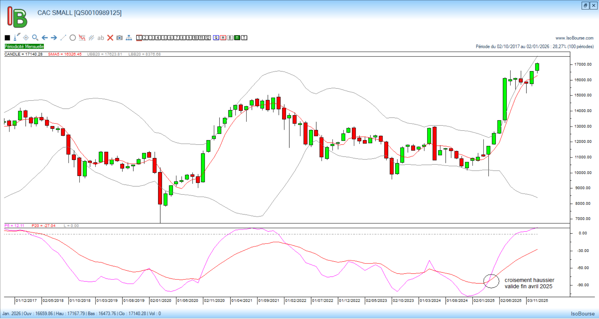 Le graphe mensuel ci-dessous reflète la performance actuelle de cet indice (+ 45 %) depuis le croisement des courbes de Pression Isobourse 5 et 20 mois validé fin avril 2025.