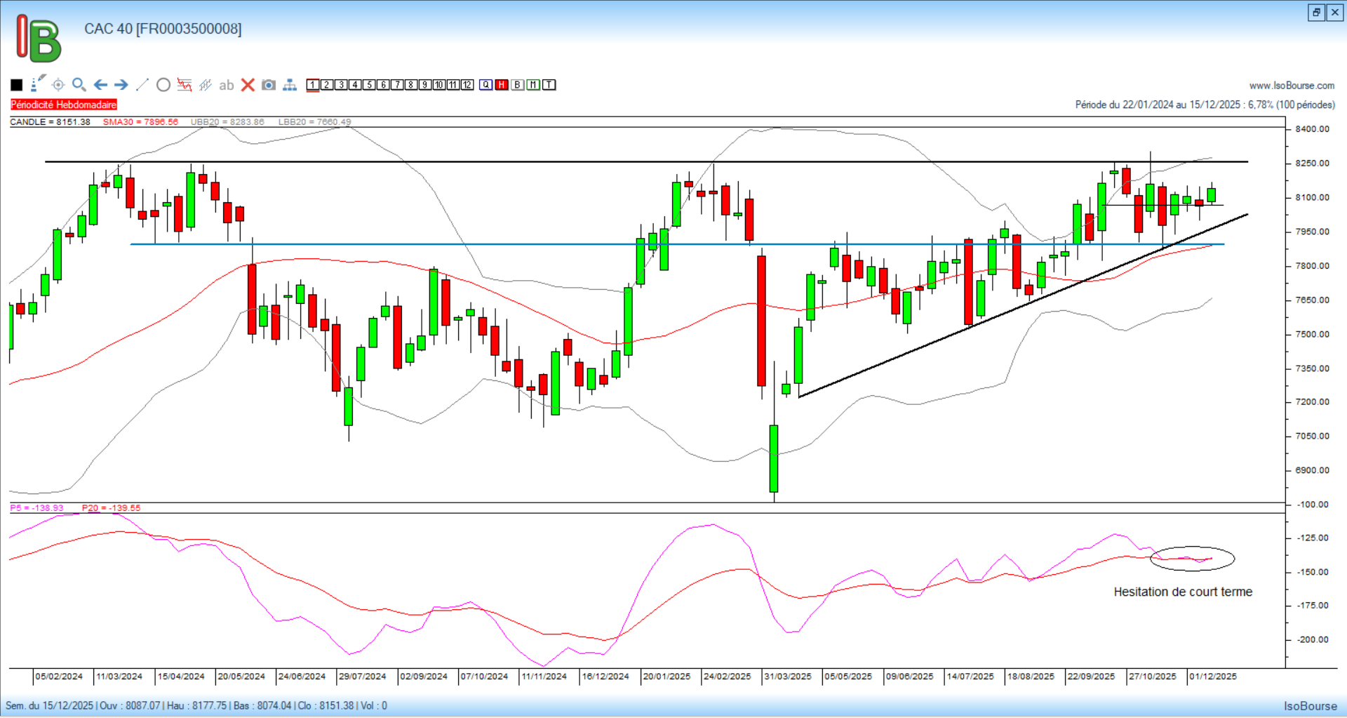 On observe toutefois, depuis 3 semaines, une diminution progressive de la volatilité matérialisée par la taille des bougies évoluant au-dessus du support des 8075 points.