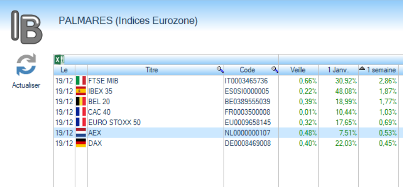 L’ensemble des indices de la zone Euro terminent la semaine en hausse. L’IBEX 35 et le FTSE MIB poursuivant inexorablement leur progression semaine après semaine pour atteindre des performances annuelles remarquables.