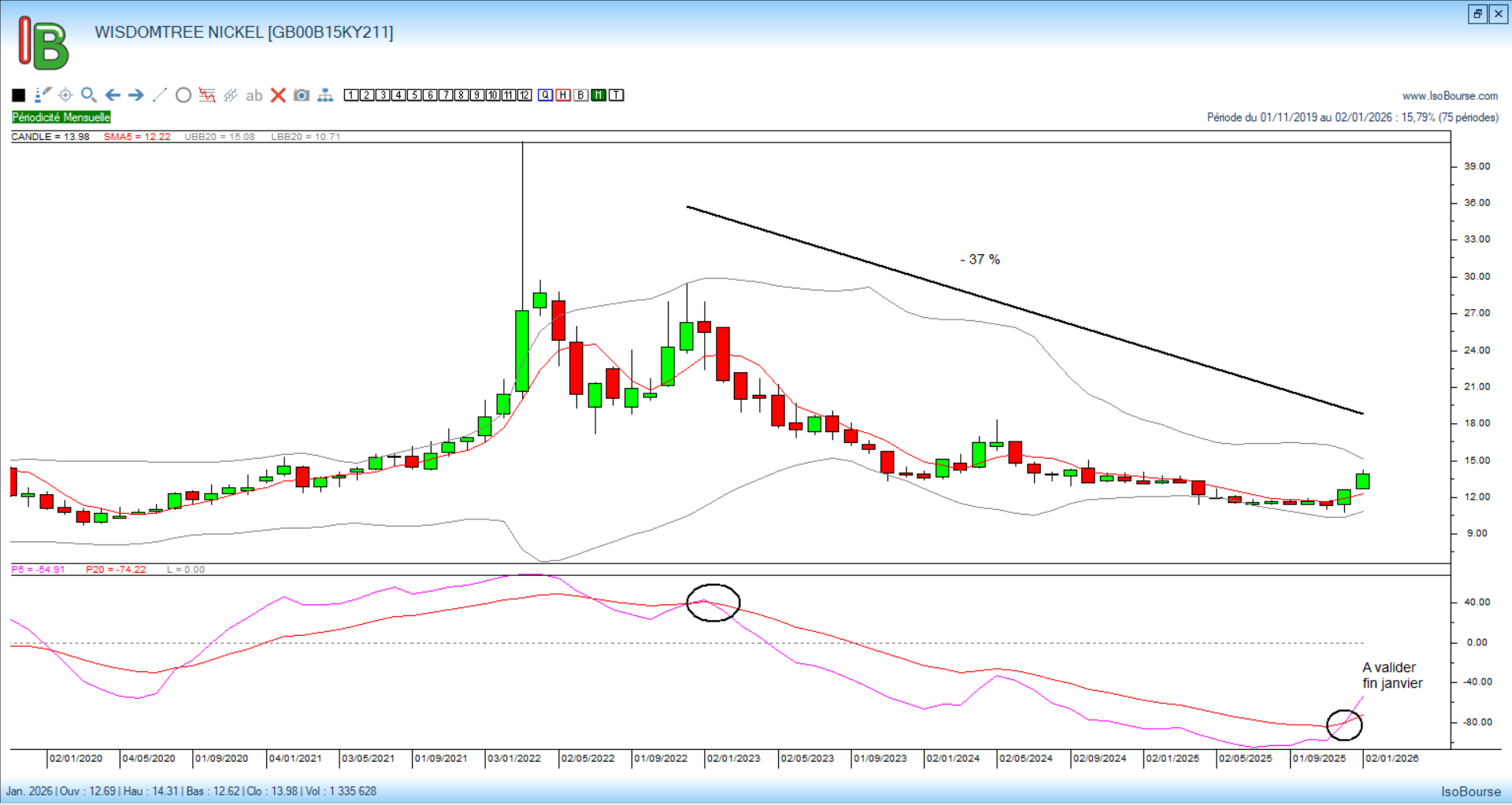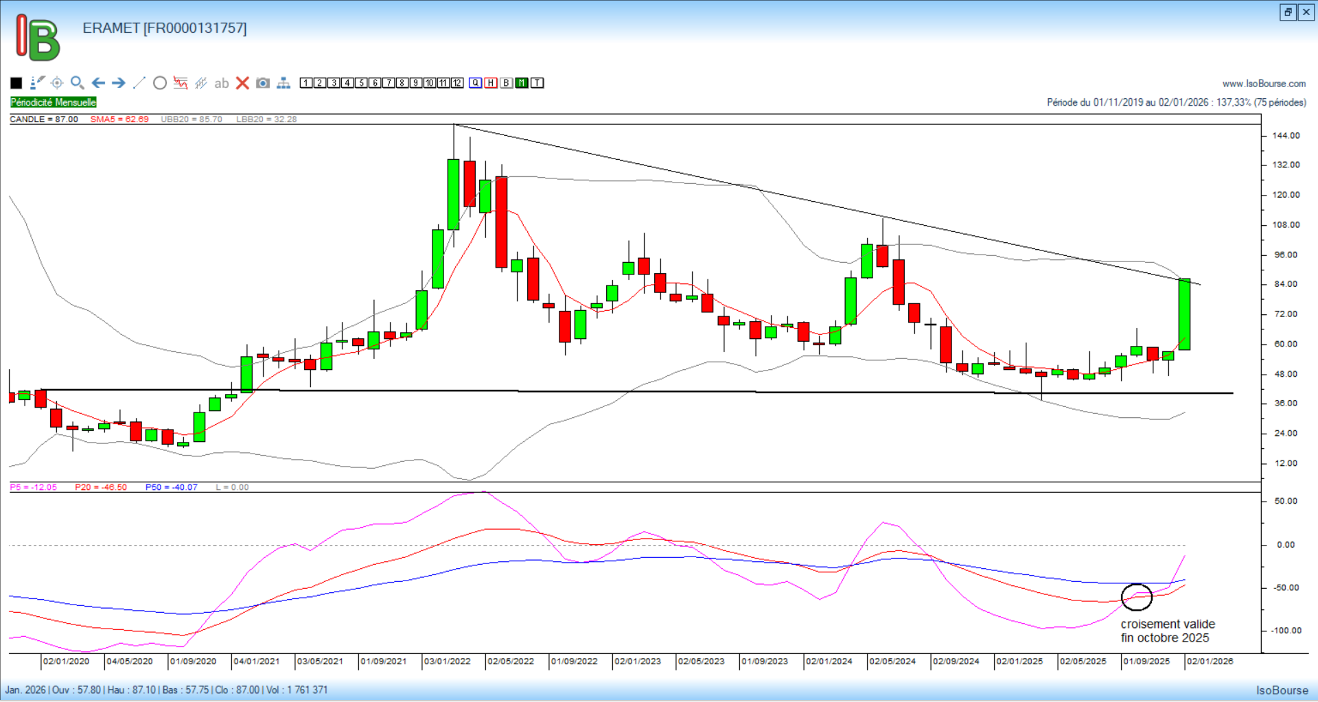 La valeur progresse depuis début janvier de près de 51 % après deux mois de volatilité consécutifs au croisement des courbes de Pression Isobourse 5 et 20 mois validé fin octobre 2025. On notera également le rapprochement des courbes de Pression 20 mois (rouge) et 50 mois (bleue) signe d’une accélération haussière à venir si ce croisement est confirmé dans quelques mois.