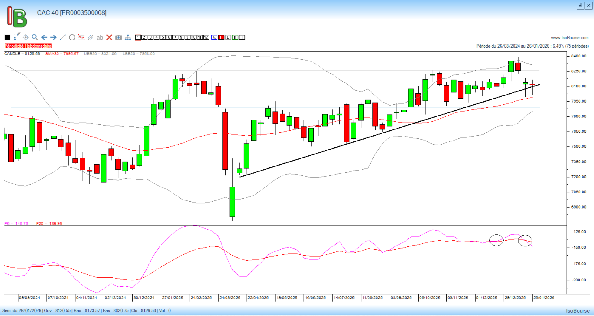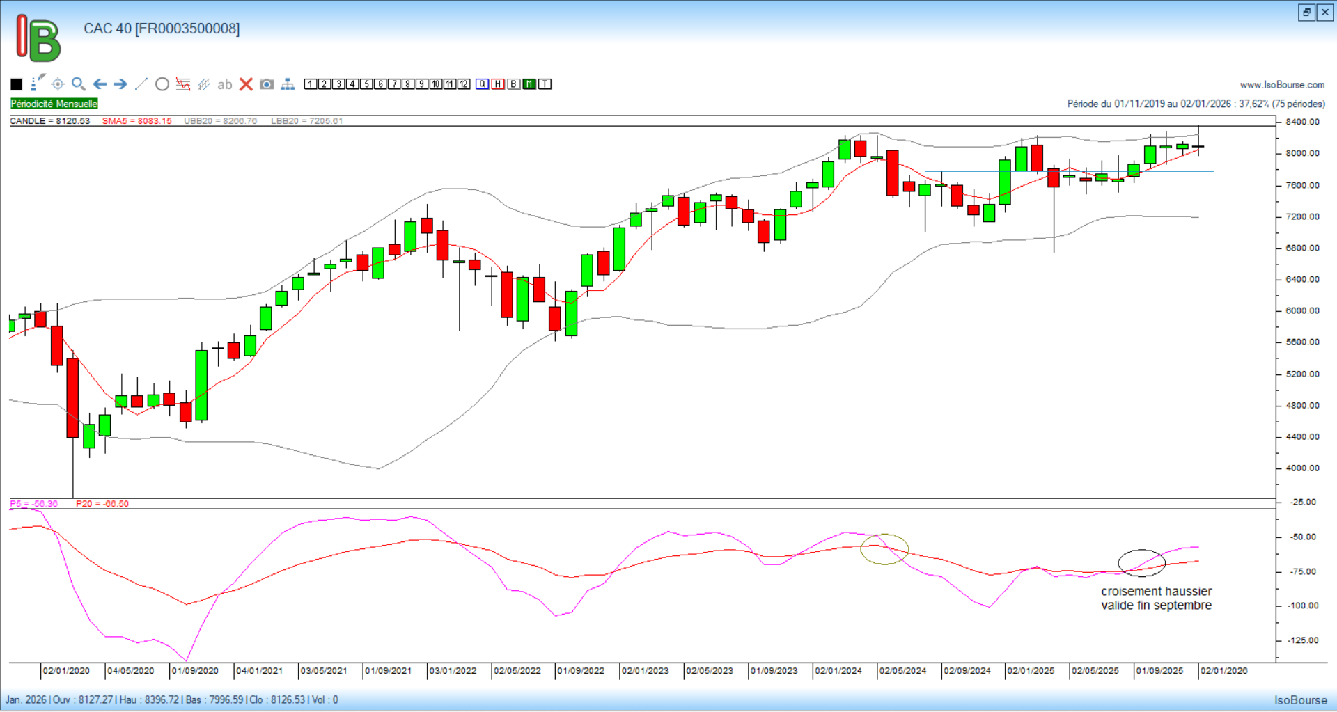 Dans ce contexte, le redressement du CAC 40 n’est pas remis en cause. Les courbes de Pression Isobourse 5 et 20 mois, depuis leur croisement haussier de septembre 2025, demeurent favorables à une évolution positive de l’indice pour les prochains mois.