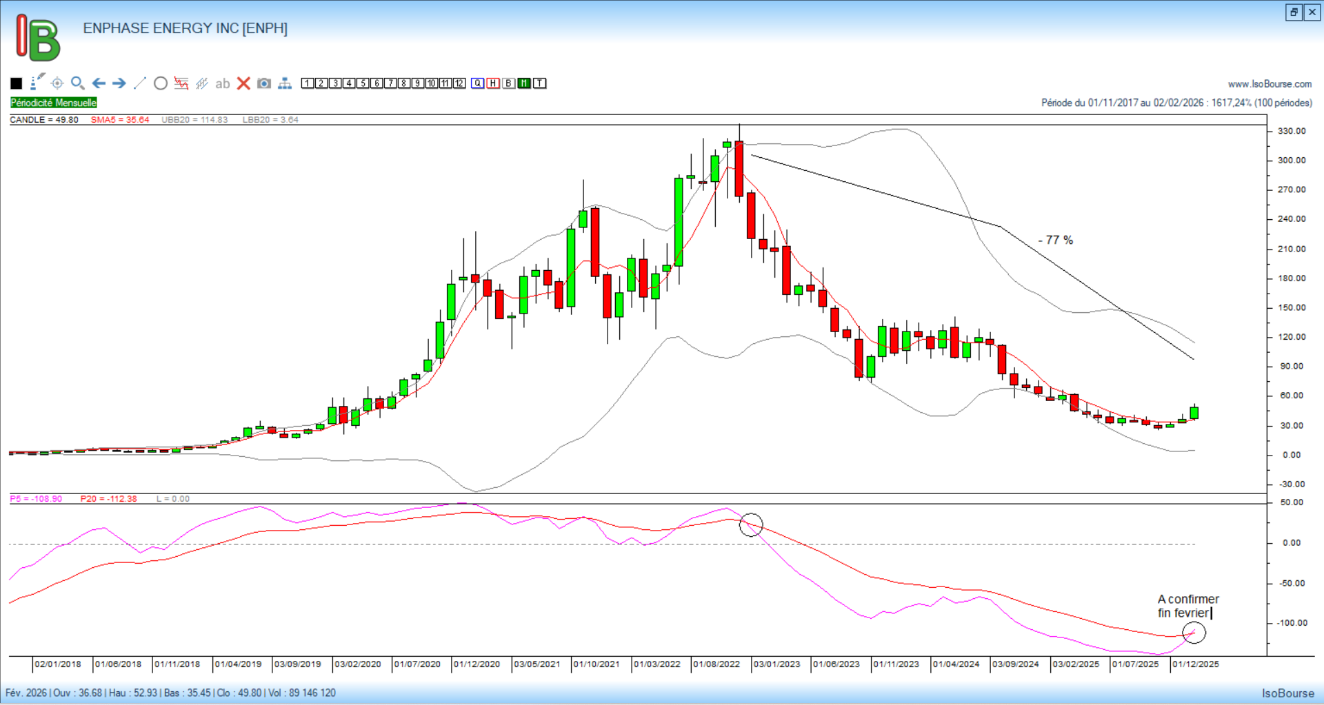 Les principales raisons qui expliquent la chute du cours d’Enphase Energy depuis fin 2022 : à la fois sectoriel (solaire), macroéconomique, réglementaire et propre à l’entreprise :