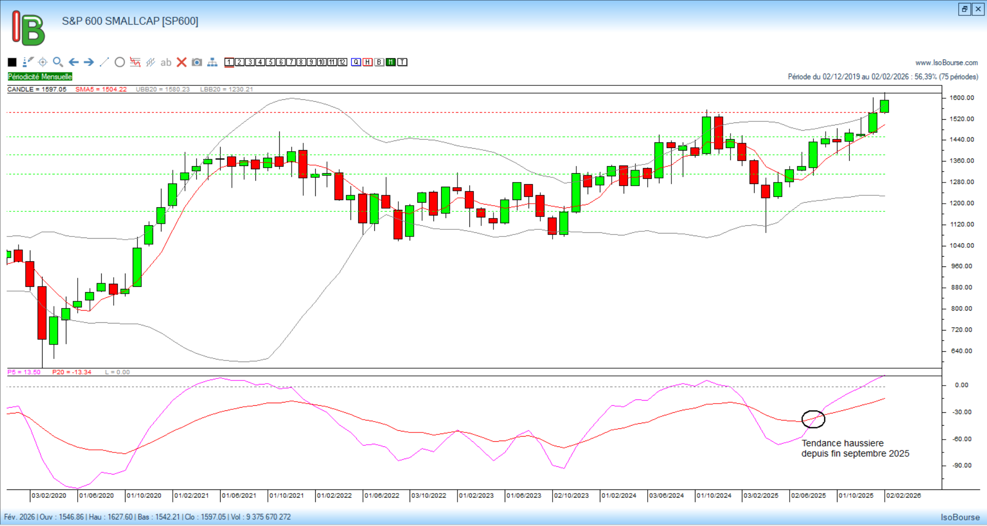 Le graphe ci-dessous montre que le S&P 600 Small Caps se trouve en tendance haussière depuis fin septembre par validation le 30 septembre du croisement des courbes de Pression Isobourse 5 et 20 mois.
