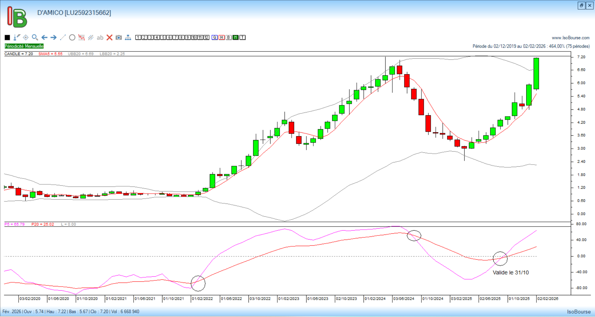 Je rappelle que la valeur est passée en tendance haussière de moyen terme à la suite du croisement des courbes de Pression Isobourse 5 et 20 mois, signal validé fin octobre 2025. Le cours s’établissait alors à 4,49 € en clôture.