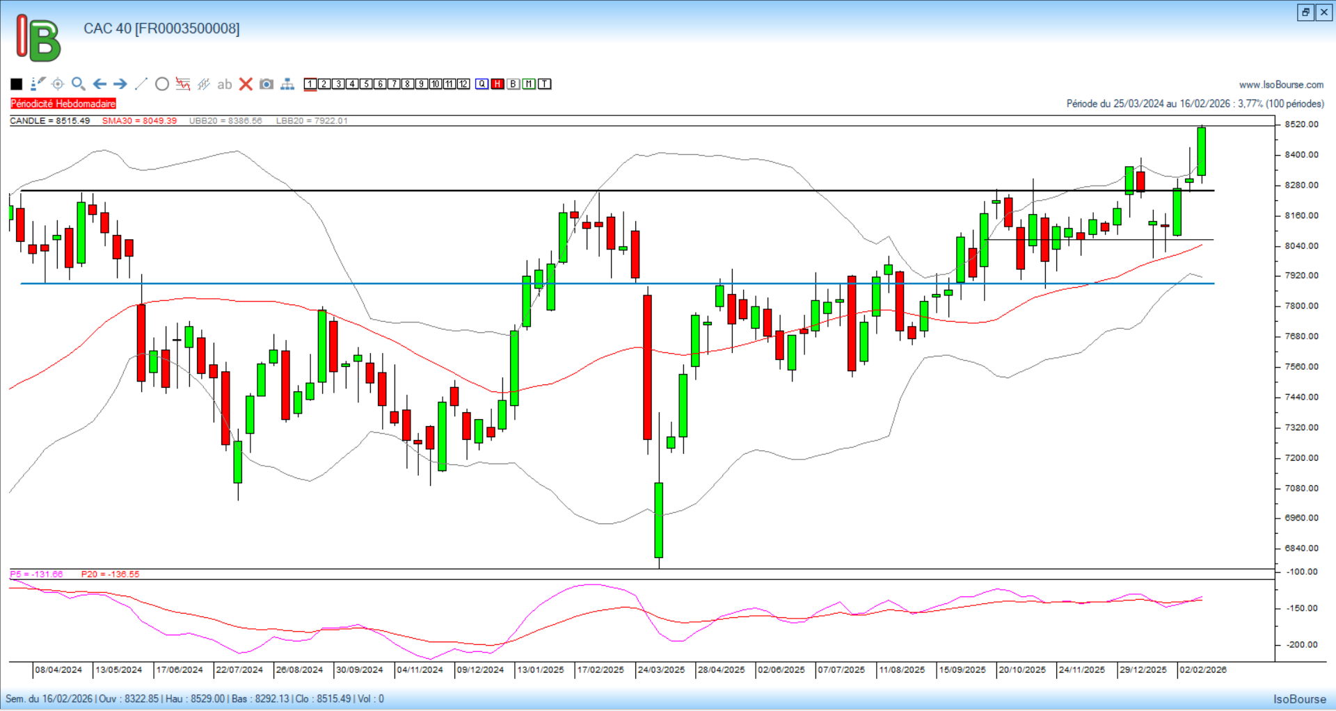 À Paris, le CAC 40 affiche une performance hebdomadaire ferme avec une progression de 2,45 % signant ainsi sa meilleure semaine depuis la mi-novembre 2025. L’indice a inscrit un nouveau record de clôture, confirmant la tendance positive de fond.