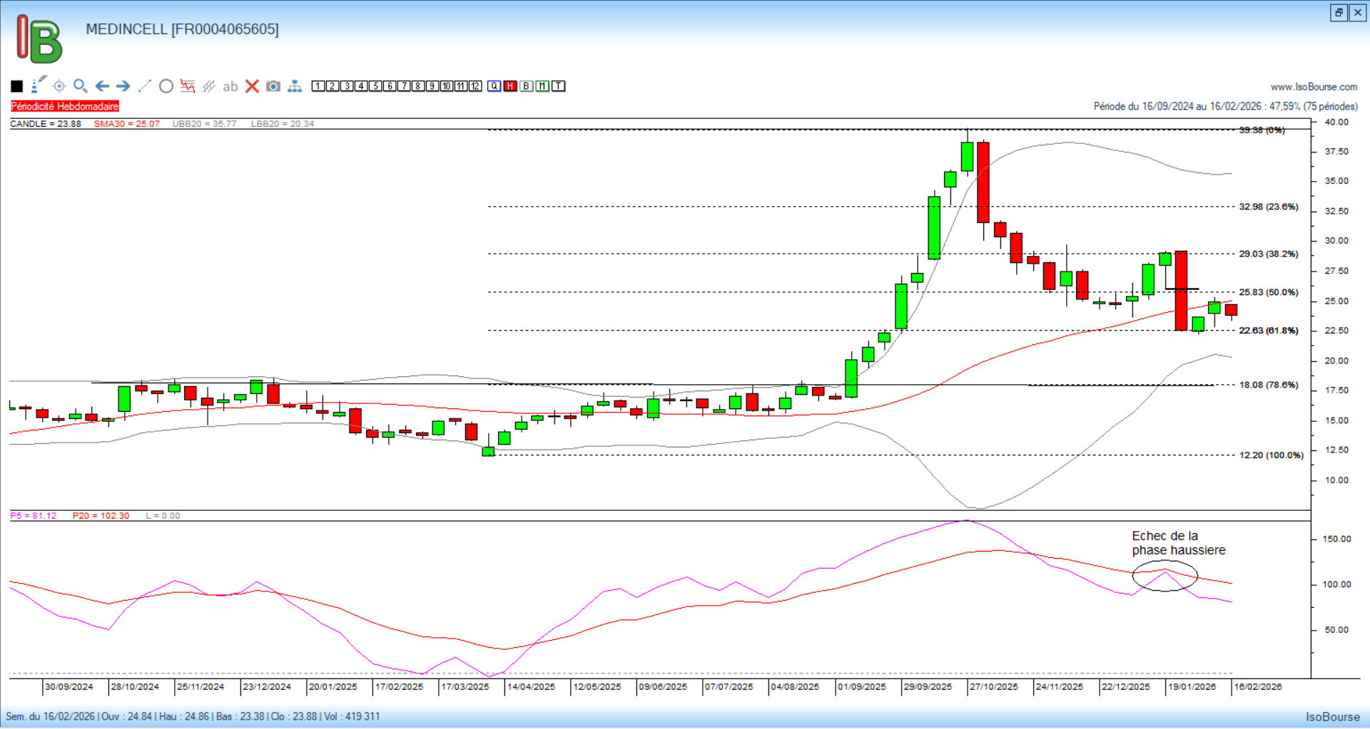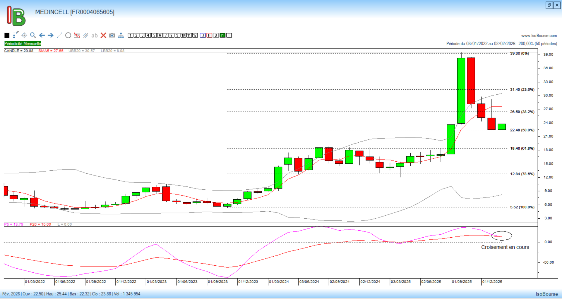 Si l’on observe maintenant le graphique mensuel à 5 séances de l’échéance de février, le titre se situe actuellement en situation de vente en raison du croisement en place des courbes de Pression Isobourse 5 et 20 mois.