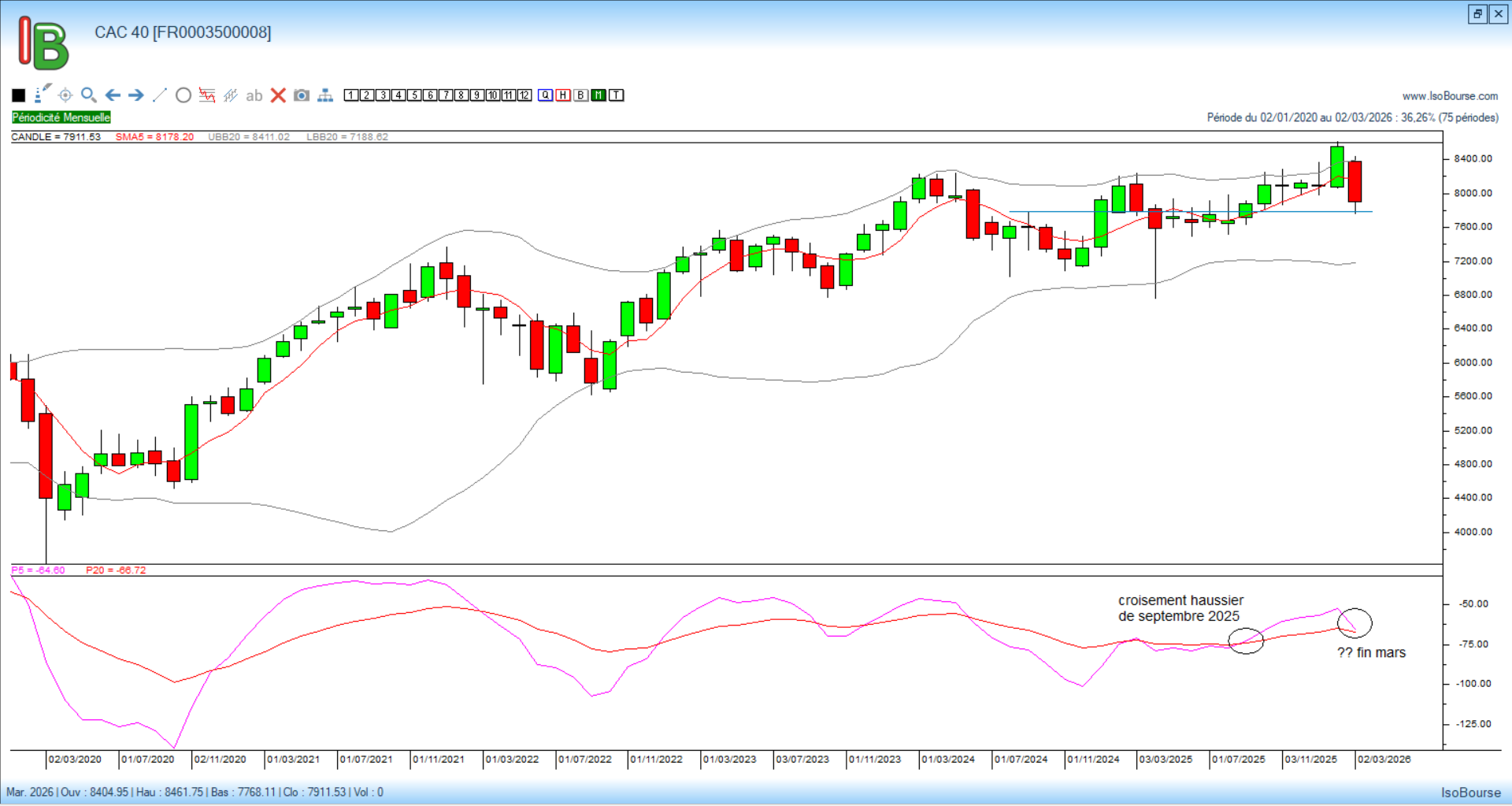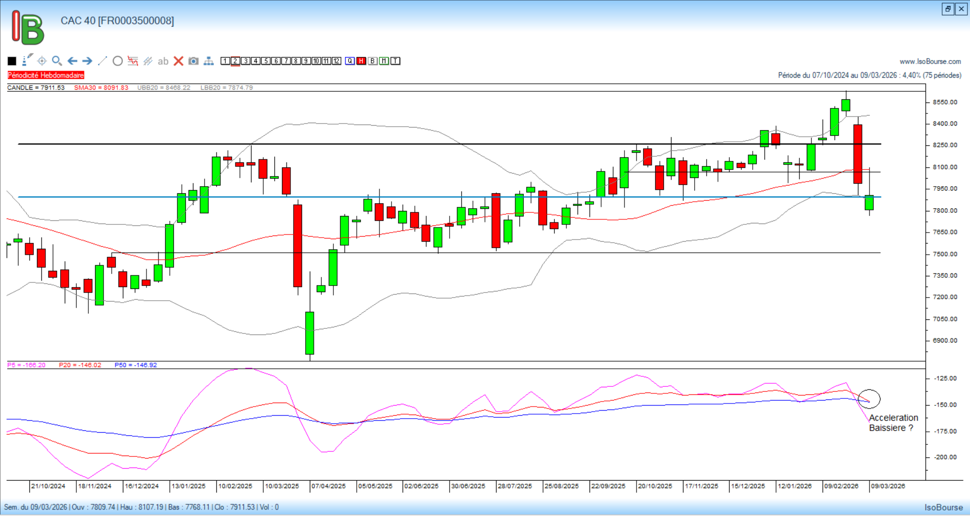 Cela dit, l’observation des courbes de pression 5 et 20 semaines montre qu’un croisement baissier est proche. Si celui-ci venait à être confirmé, nous assisterions à une accélération baissière en direction des 7705 points, niveau qui correspond par ailleurs au retracement de 50 % de la hausse amorcée en avril 2025, déjà évoqué la semaine dernière.