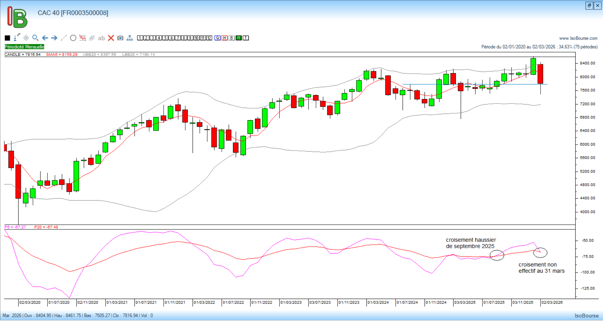 Dans mon article du 27 mars, le graphique mensuel du CAC 40 signalait un croisement baissier en cours des courbes de Pression Isobourse 5 et 20 mois. Deux séances plus tard, ce signal n’existe plus !