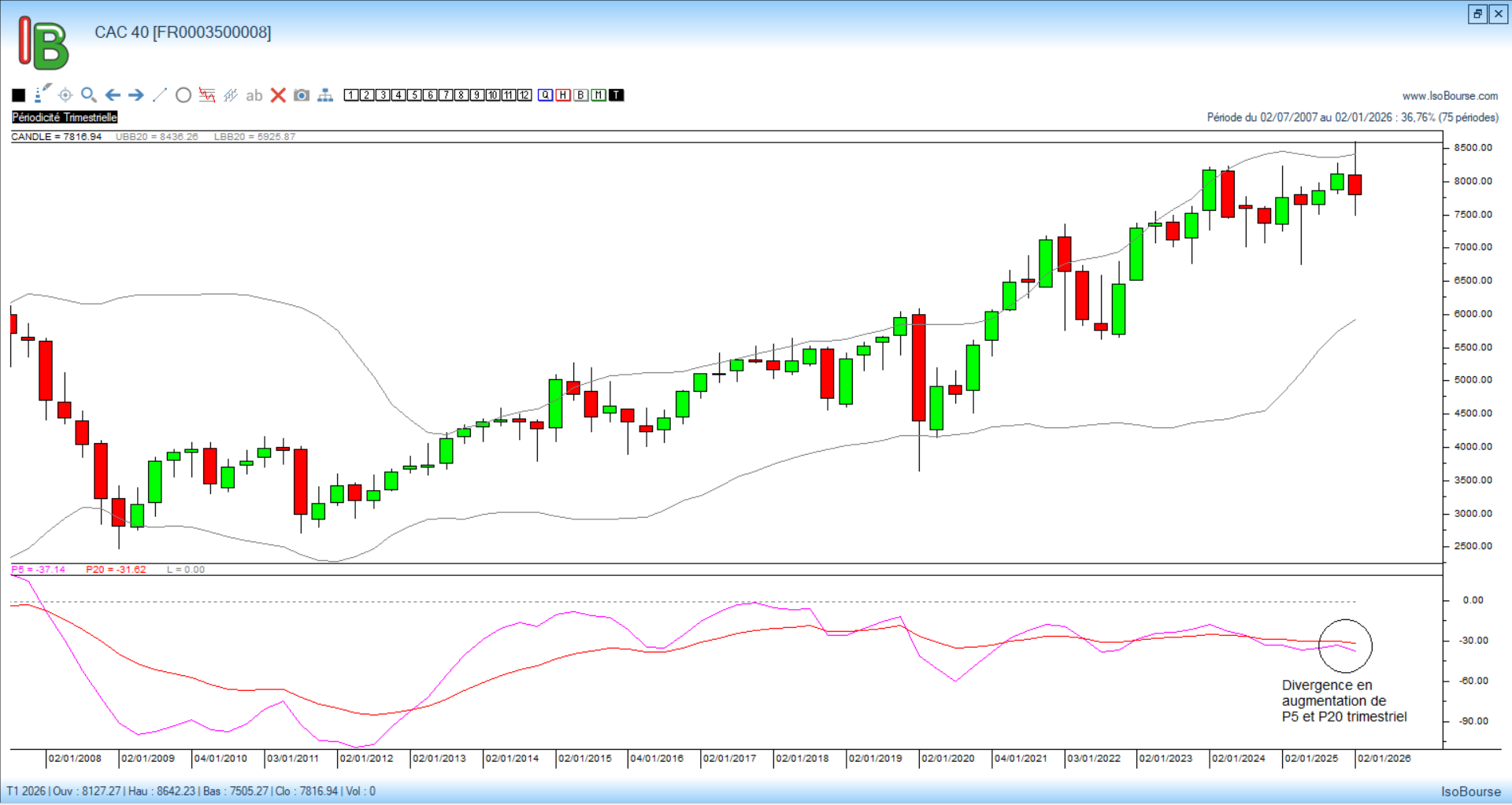 Si l’on en vient au graphique trimestriel, les courbes de Pression 5 et 20 trimestres présente une divergence en augmentation malgré que la bougie trimestrielle montre, en dehors de sa forte amplitude une certaine stabilisation entre acheteurs et vendeurs.