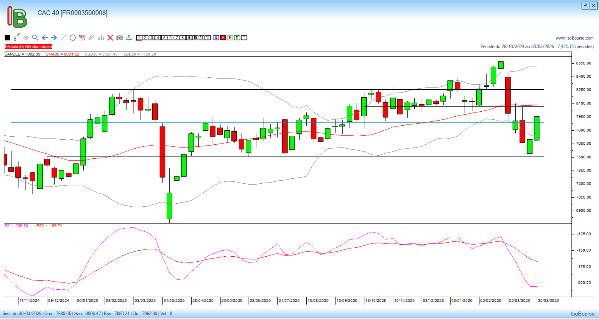 Sur l’unité de temps hebdomadaire, le CAC 40 progresse de +3,38 % avec la formation d’un marubozu vert significatif permettant à l’indice de s’établir au-dessus de la résistance des 7905 points.