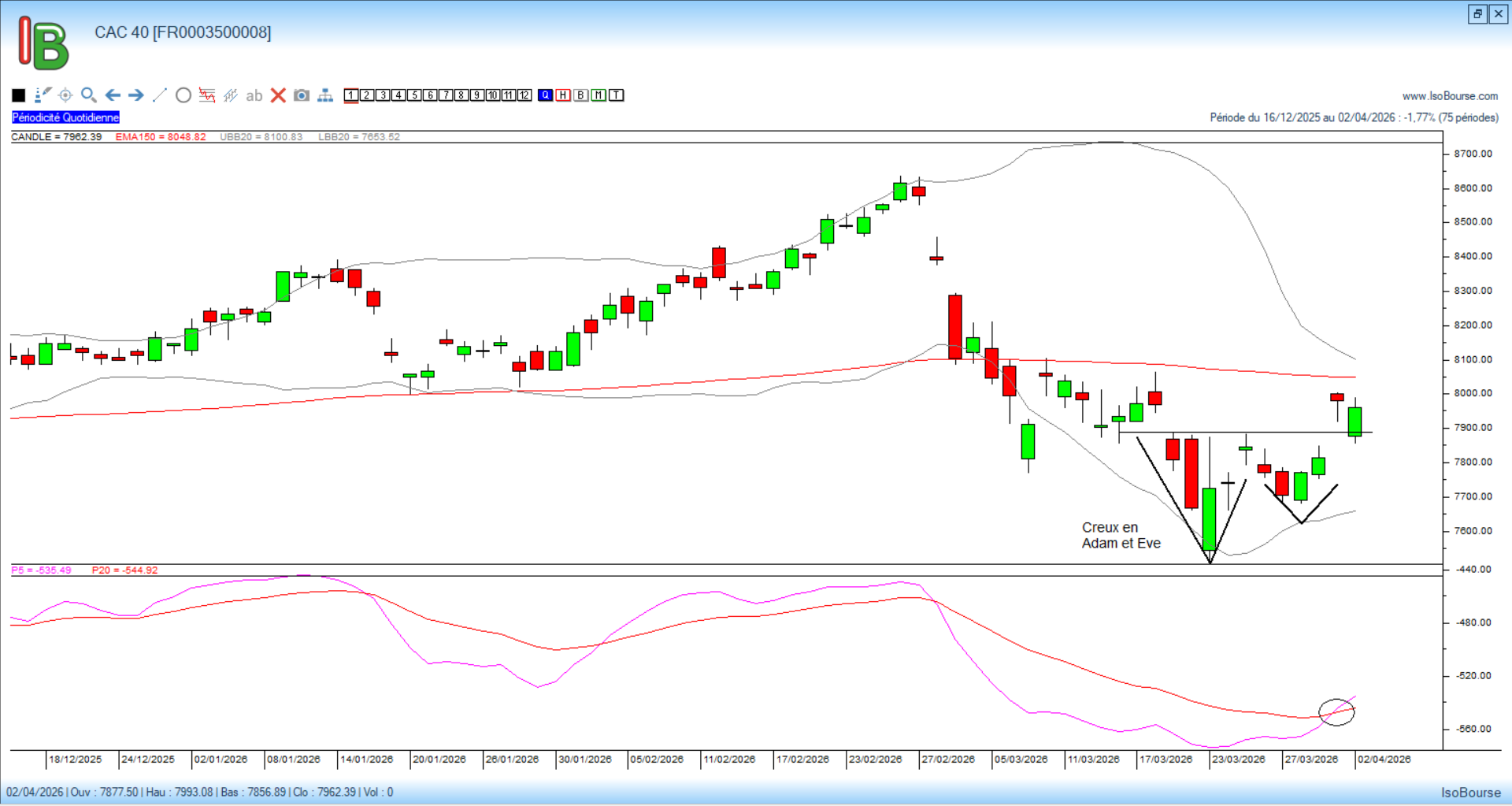 Ces volumes peuvent toutefois sembler trop faibles pour confirmer pleinement la validité du signal. Néanmoins, les courbes de Pression Isobourse 5 et 20 jours signalent le passage en tendance haussière de très court terme, validé à l’issue de la séance du 1er avril.