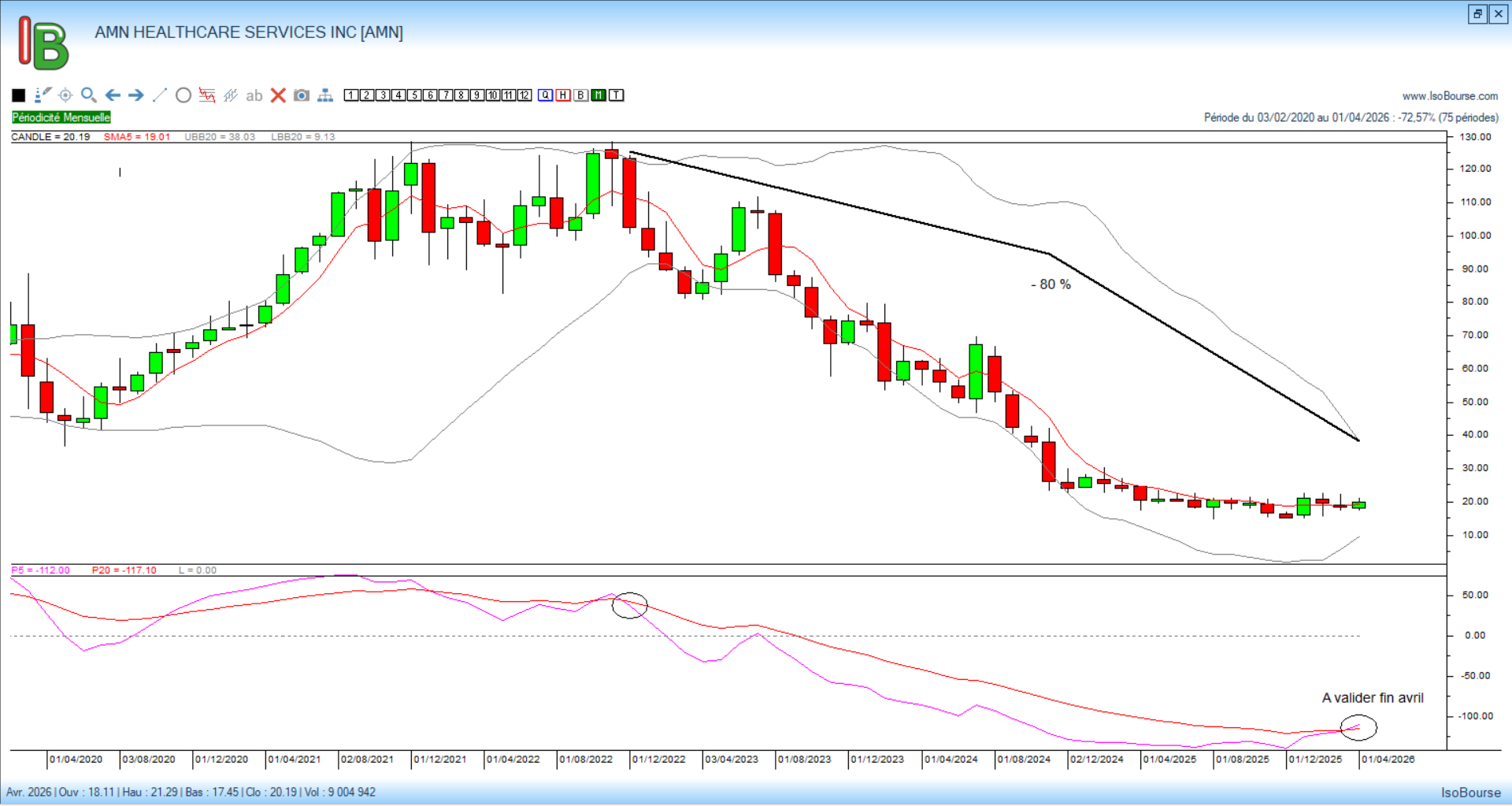 Ces points forts dans un secteur porteur aux US (Indice sectoriel haussier) et la lecture du graphique mensuel après une chute de 80 % du cours de bourse post années Covid, méritent que l’on observe le comportement du croisement des courbes de Pression Isobourse 5 et 20 mois au cours des 9 prochaines séances.