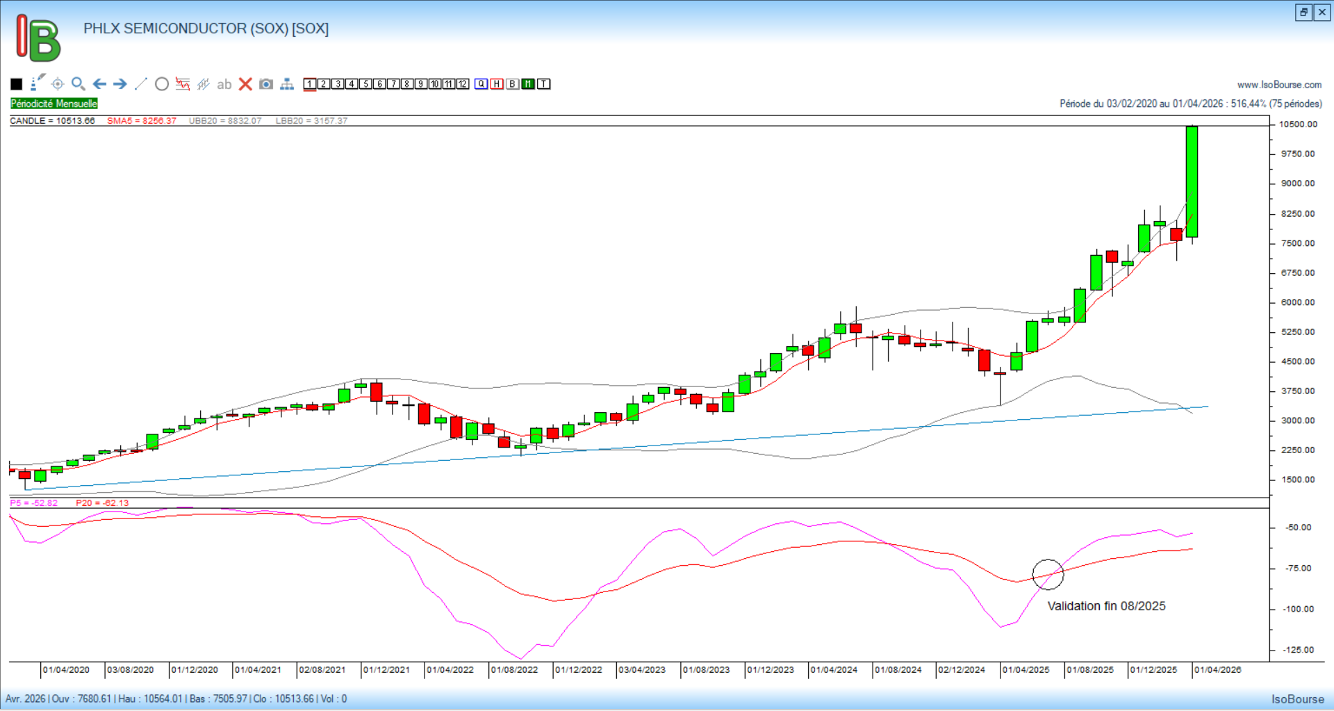 Suite à ma dernière intervention sur cet indice (Secteur des semi-conducteurs : tendance du SOX et analyse technique de Soitec – Les pépites de J.M) le 14 mars dernier, une correction semblait se mettre en place après son passage en tendance haussière fin août 2025.