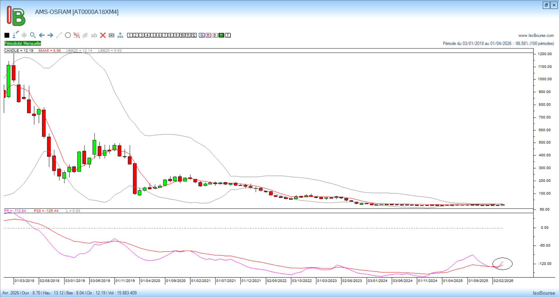 Le passage du titre en tendance haussière sera très probablement validé en cette fin du mois d’avril par le croisement des courbes de Pression Isobourse 5 et 20 mois (graphique de gauche)